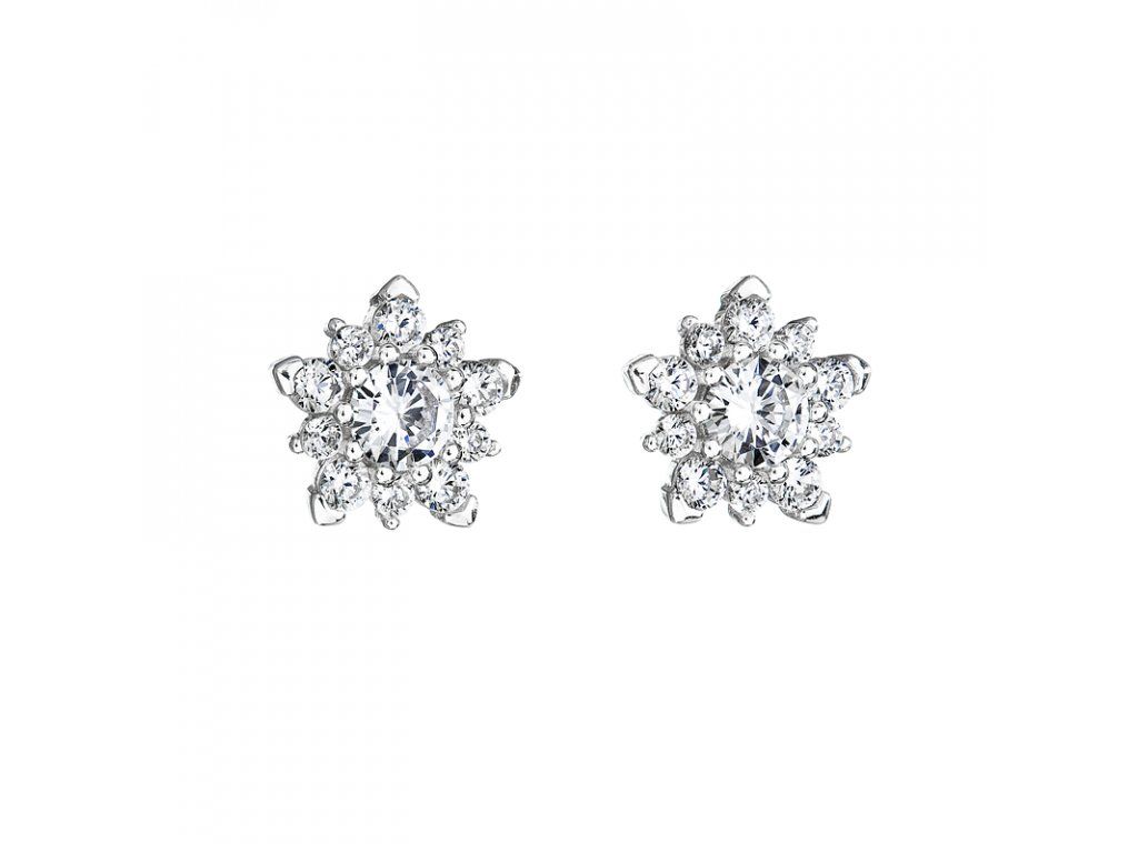 Stříbrné náušnice Hvězda s bílými zirkony se krásně třpytí. Stačí pouhý dotek slunečních paprsků a jedenáct párů zirkonů začne nádherně zářit.